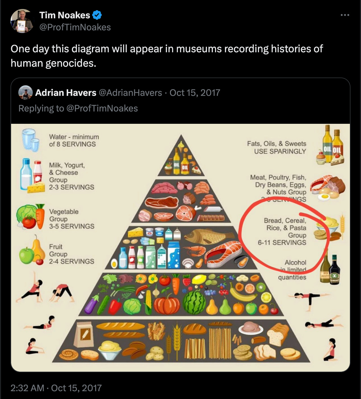 Tim Noakes hates carbs. A lot. His Twitter/X account has almost a quarter of a million posts defaming the most abundant macronutrient in nature. He has blamed carbs for everything from Alzheimer’s disease to the Holocaust (no joke) and labeled the USDA’s former grain-heavy dietary recommendations “genocide”. One wonders if carbs did something to hurt little Timmy when he was a boy—bullied him at school or whatever.